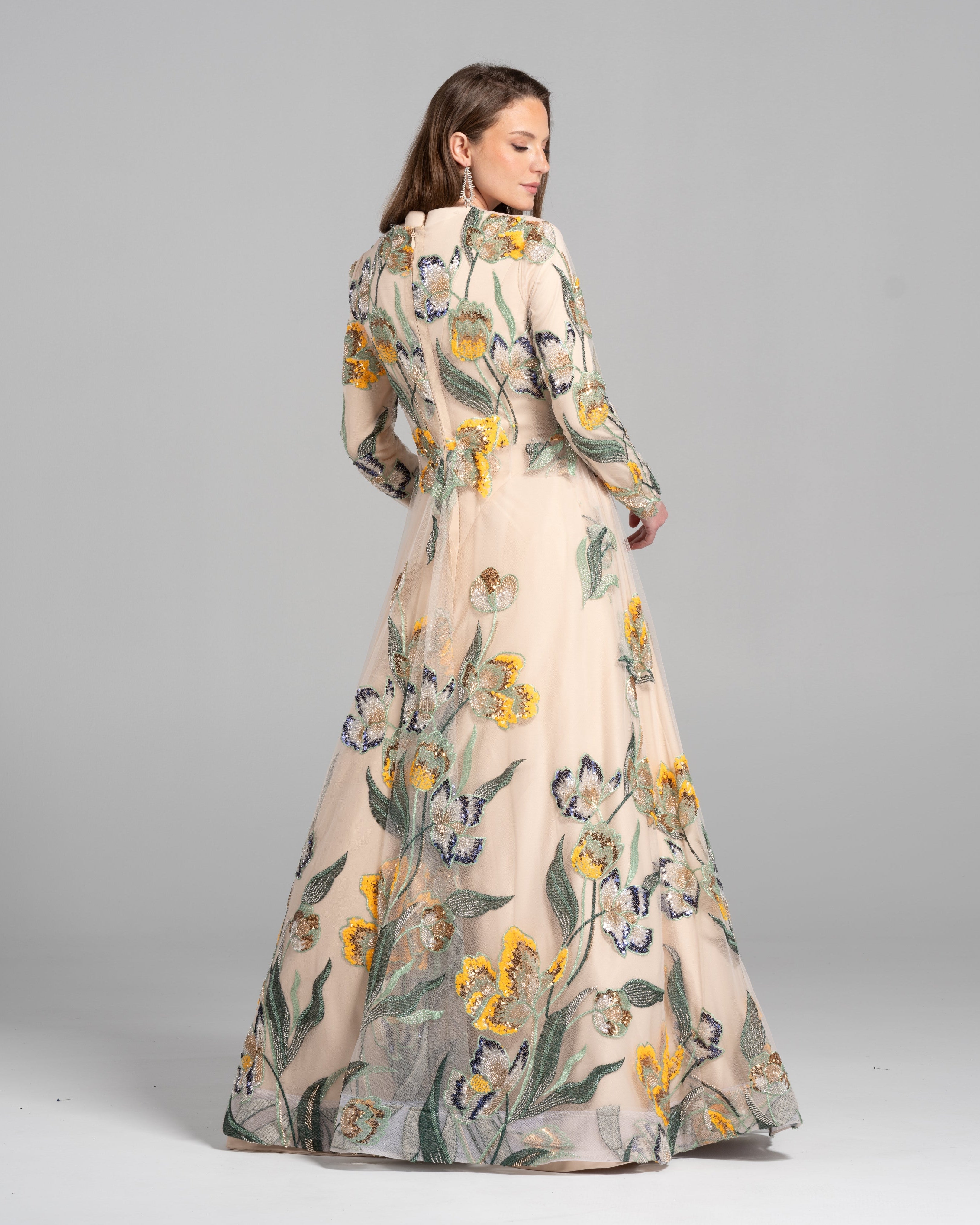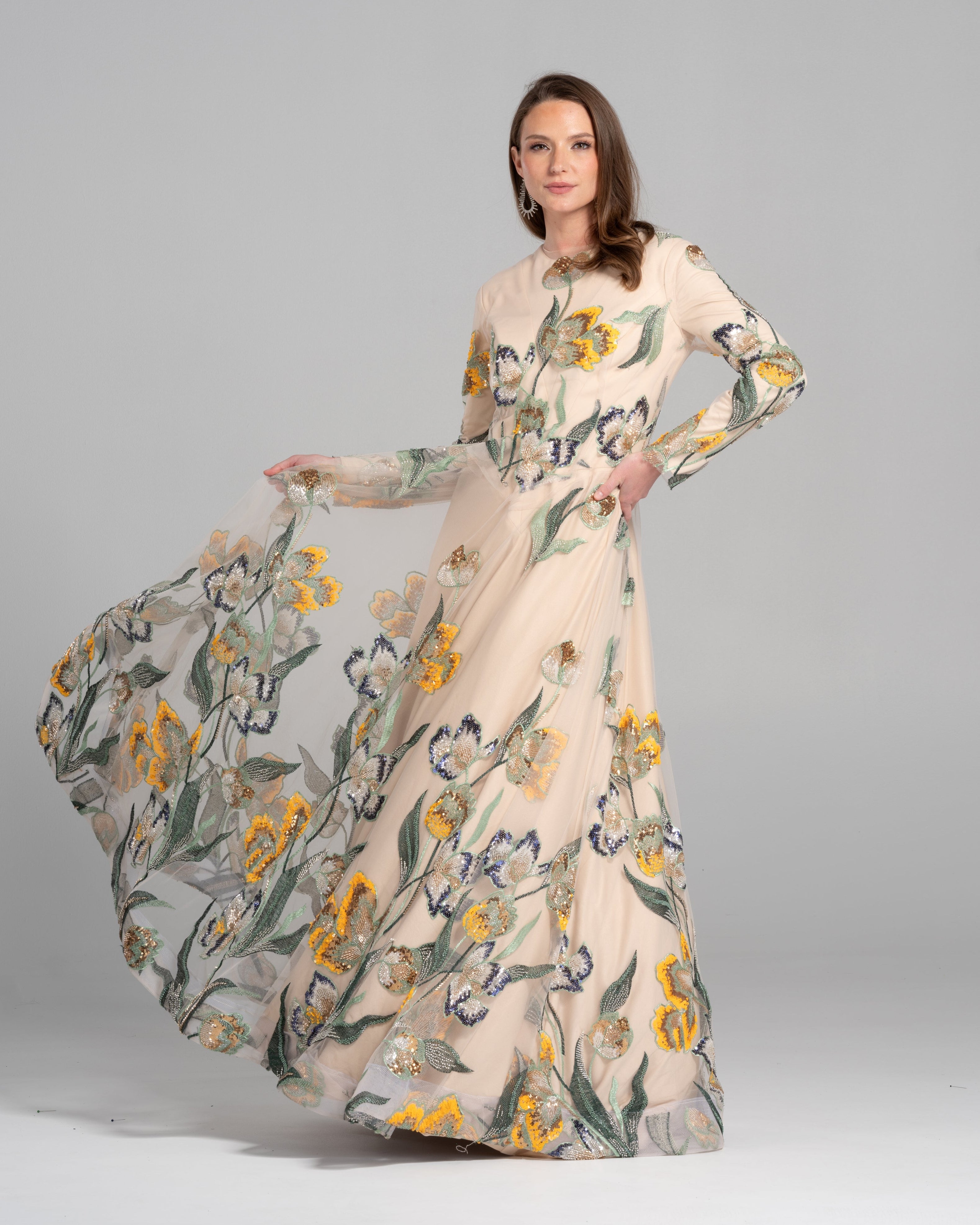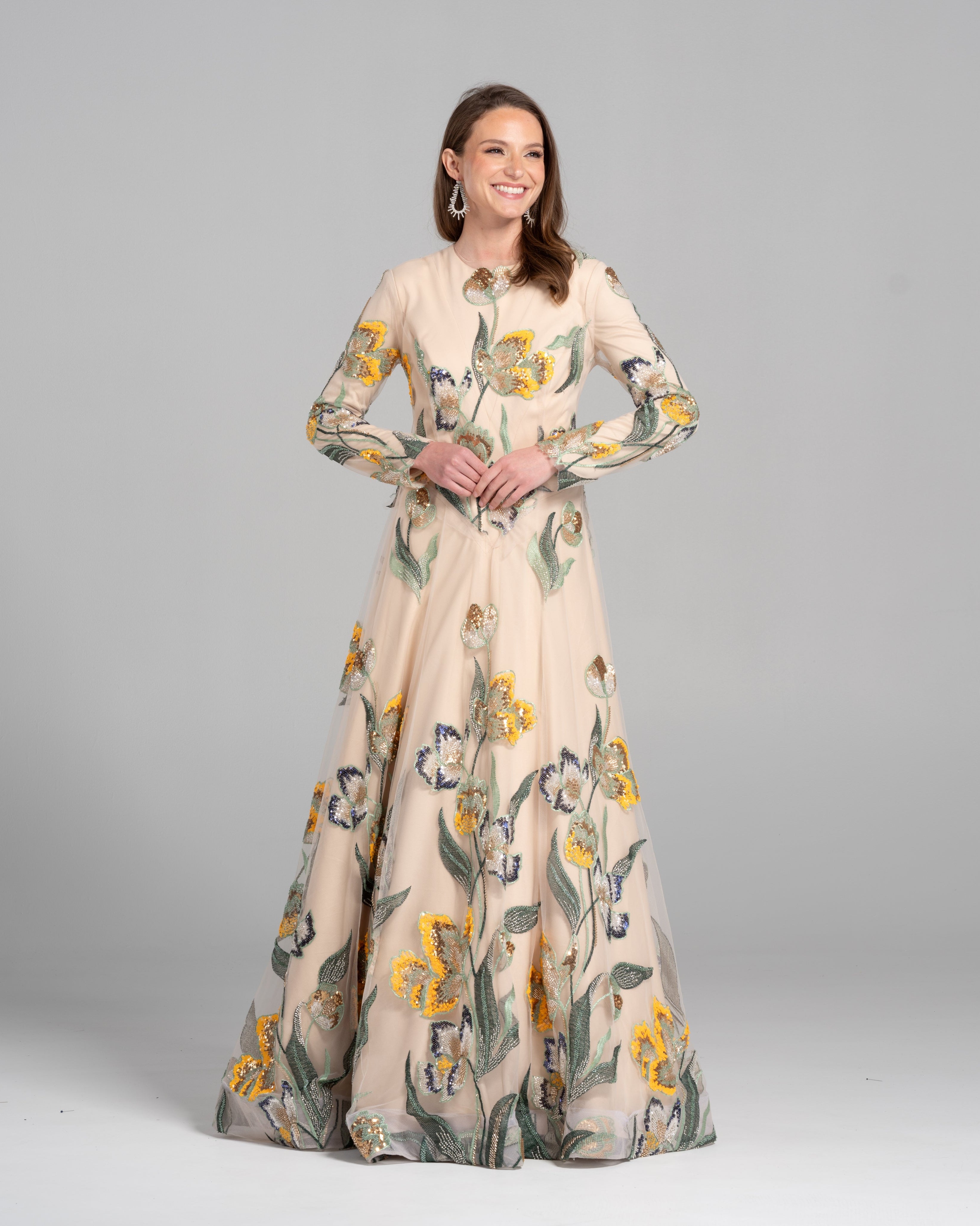 A soft nude base comes to life with intricate, hand-beaded florals in warm golden tones, soft blues, and muted greens. The fitted bodice with a clean neckline and long sleeves flows into a flattering v-waist and a full, airy skirt.