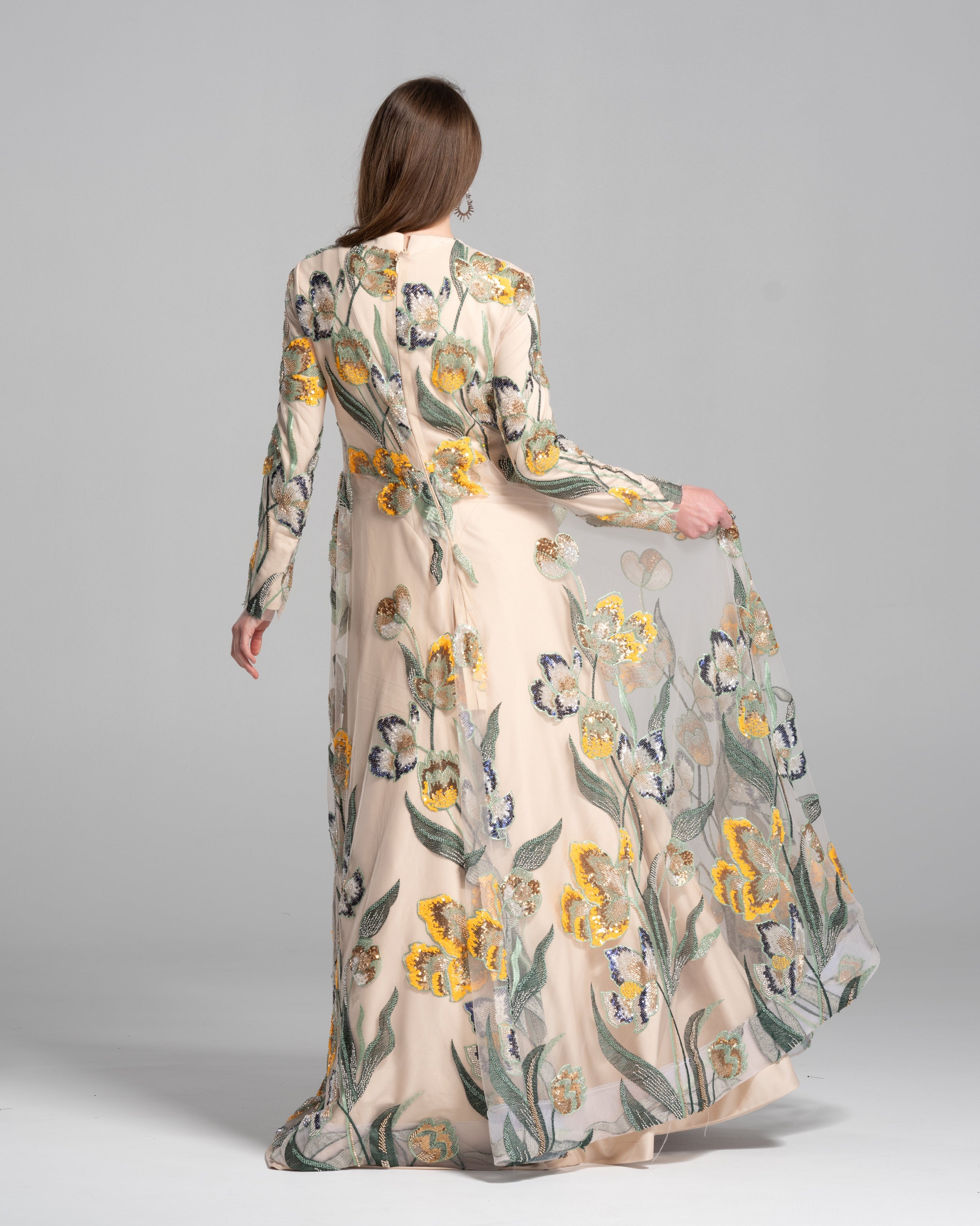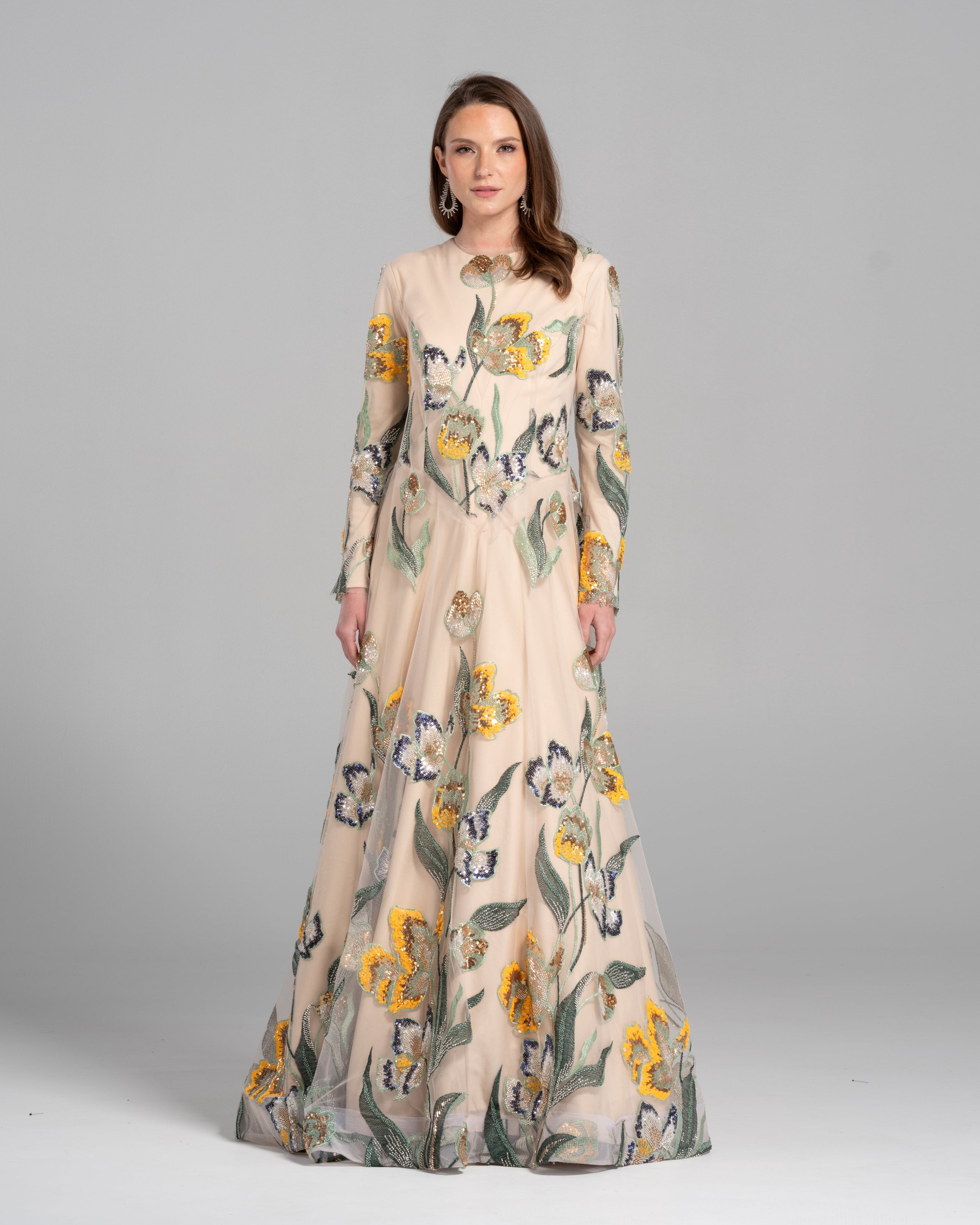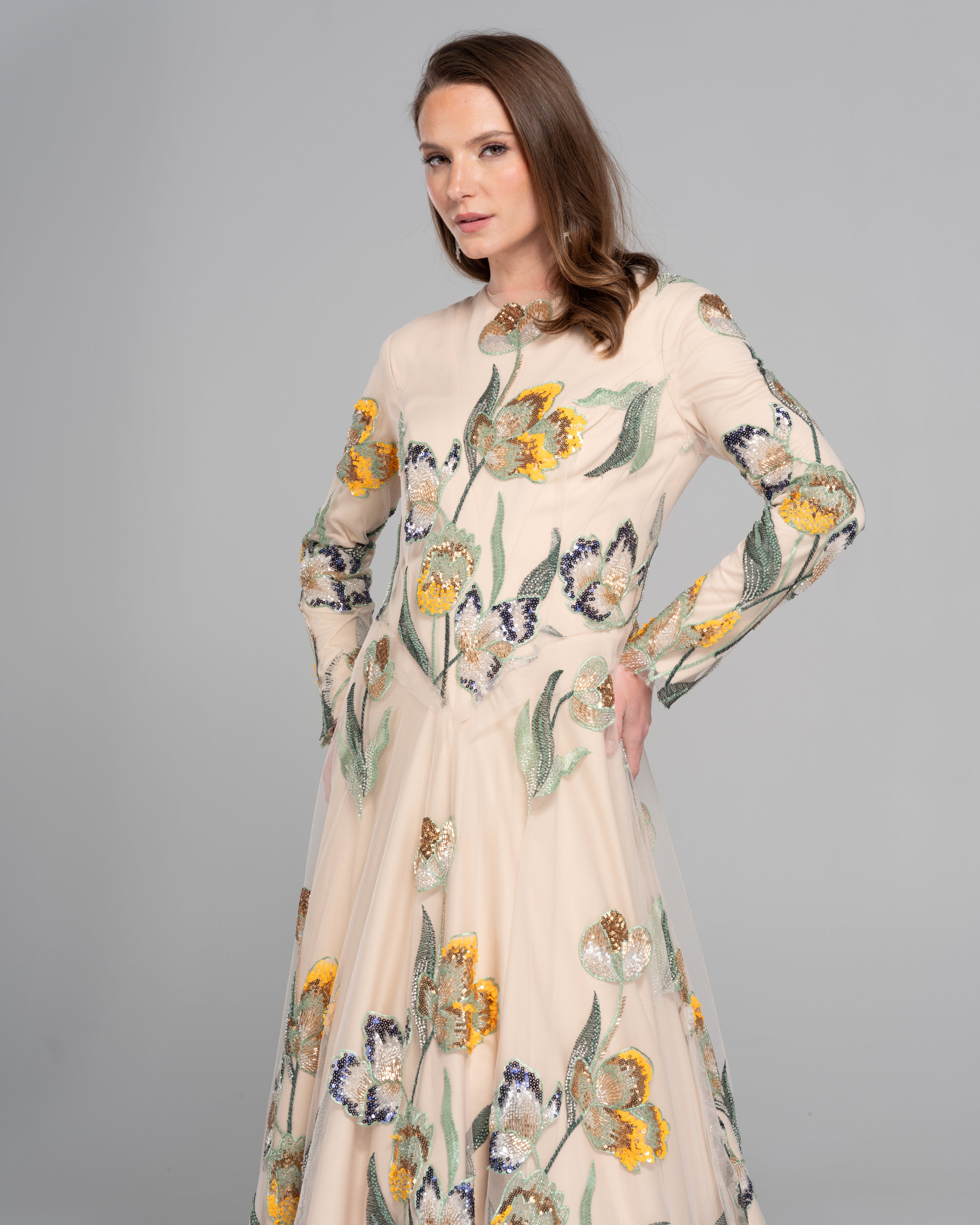 A soft nude base comes to life with intricate, hand-beaded florals in warm golden tones, soft blues, and muted greens. The fitted bodice with a clean neckline and long sleeves flows into a flattering v-waist and a full, airy skirt.