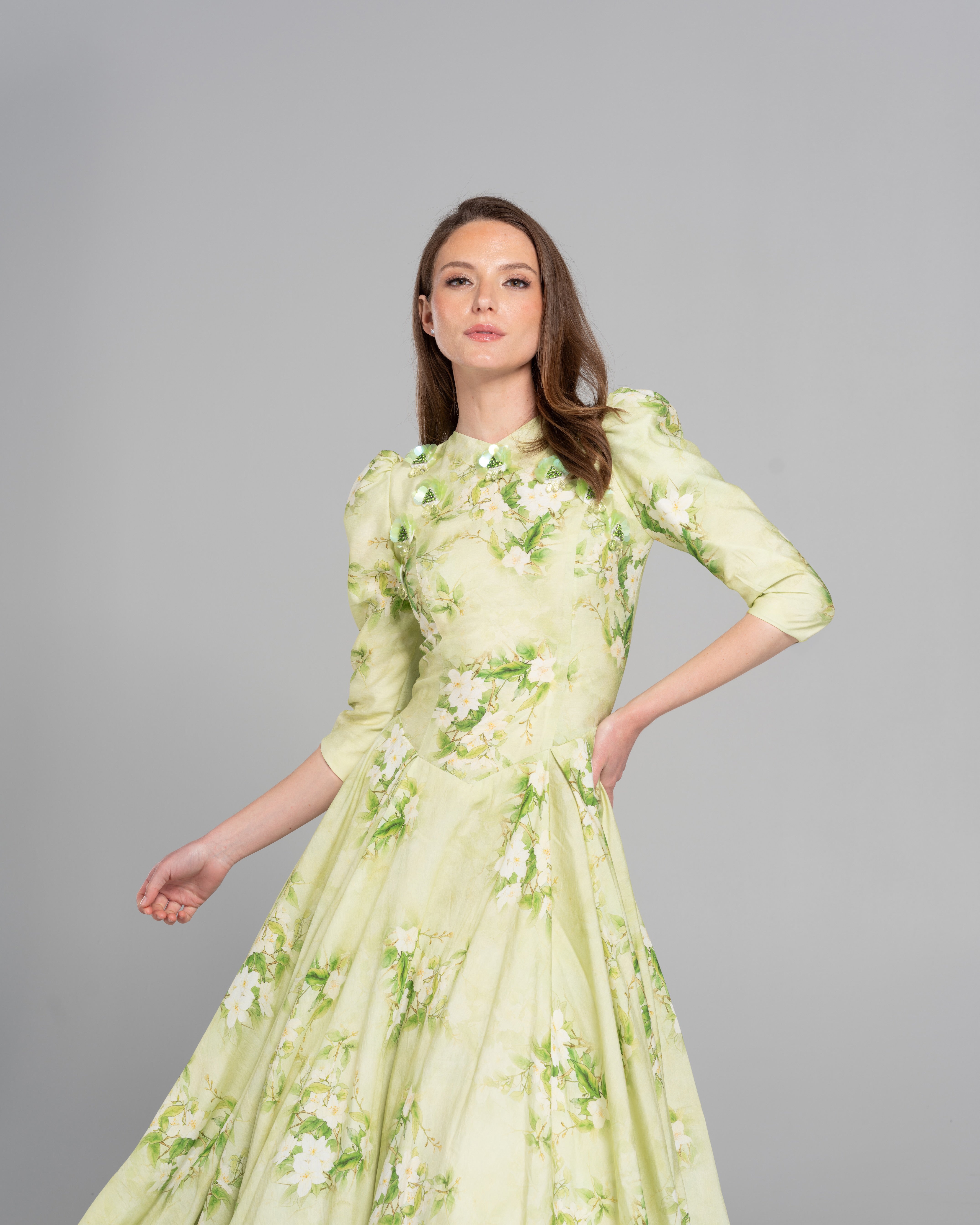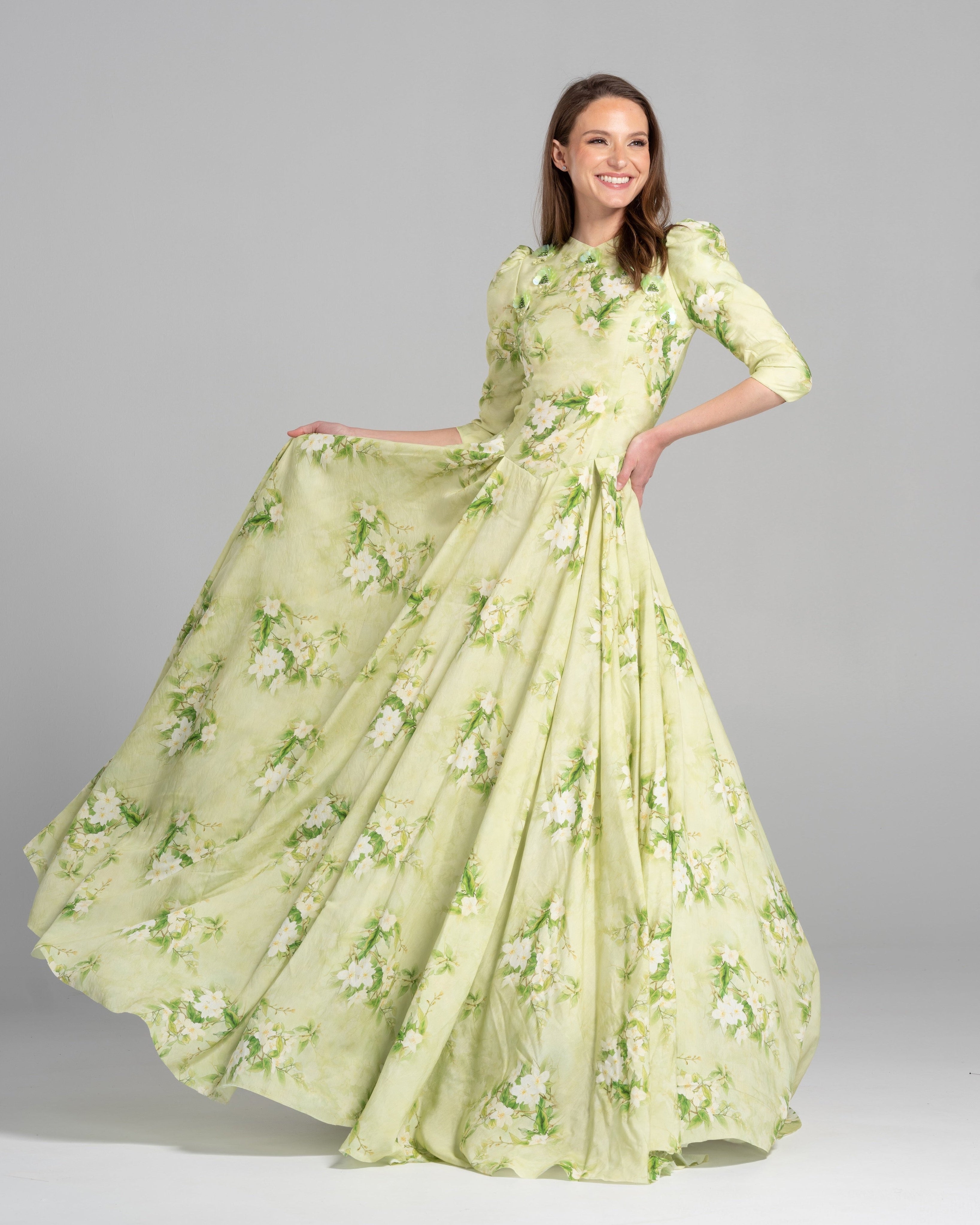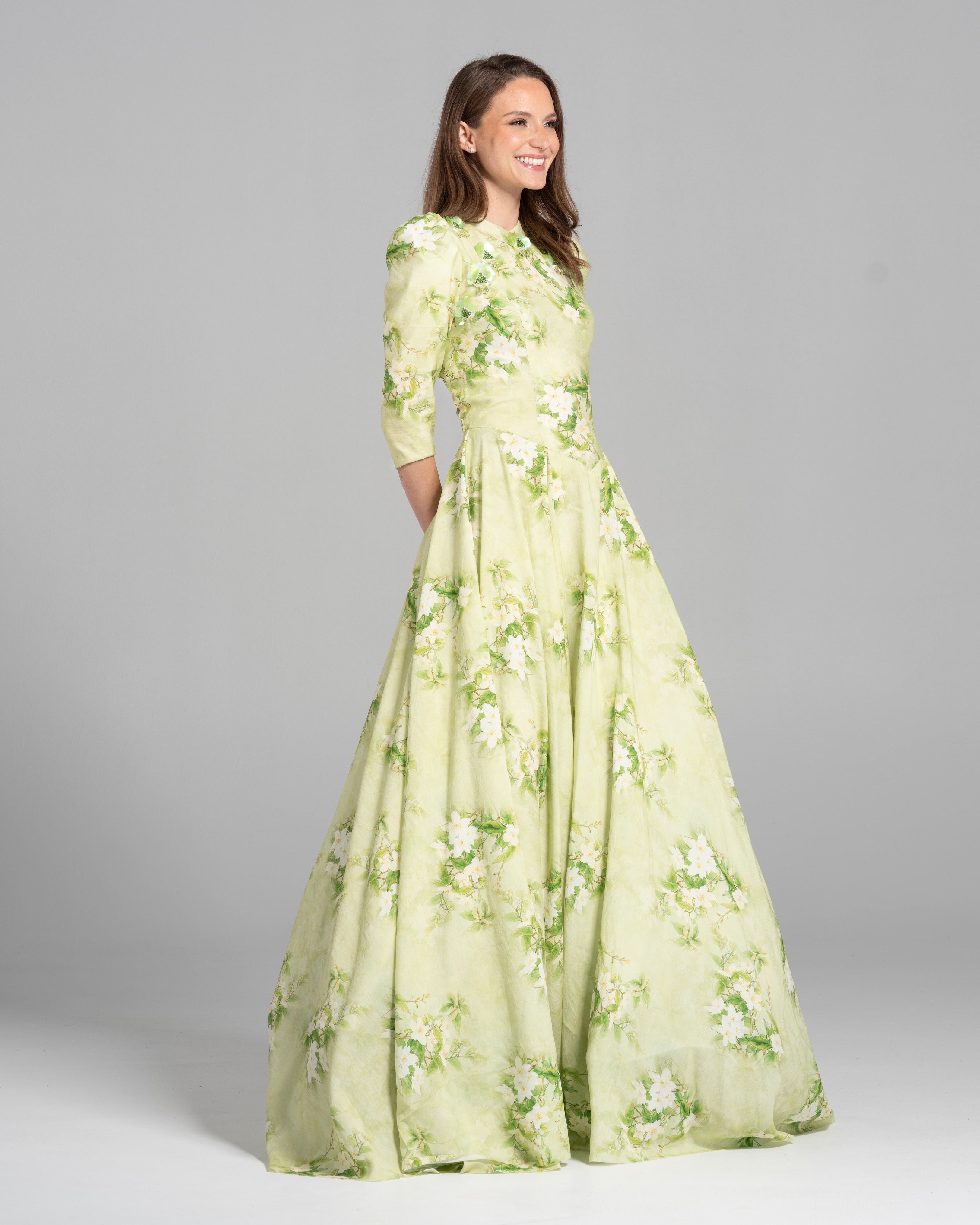 This gown features a soft celadon floral print with delicate floral appliqués along the bodice, adding texture and dimension to its fresh, romantic feel. The flattering V waistline enhances the silhouette, flowing into a full skirt. Finished with graceful sleeves and an airy structure, it’s an effortless standout for spring occasions.
