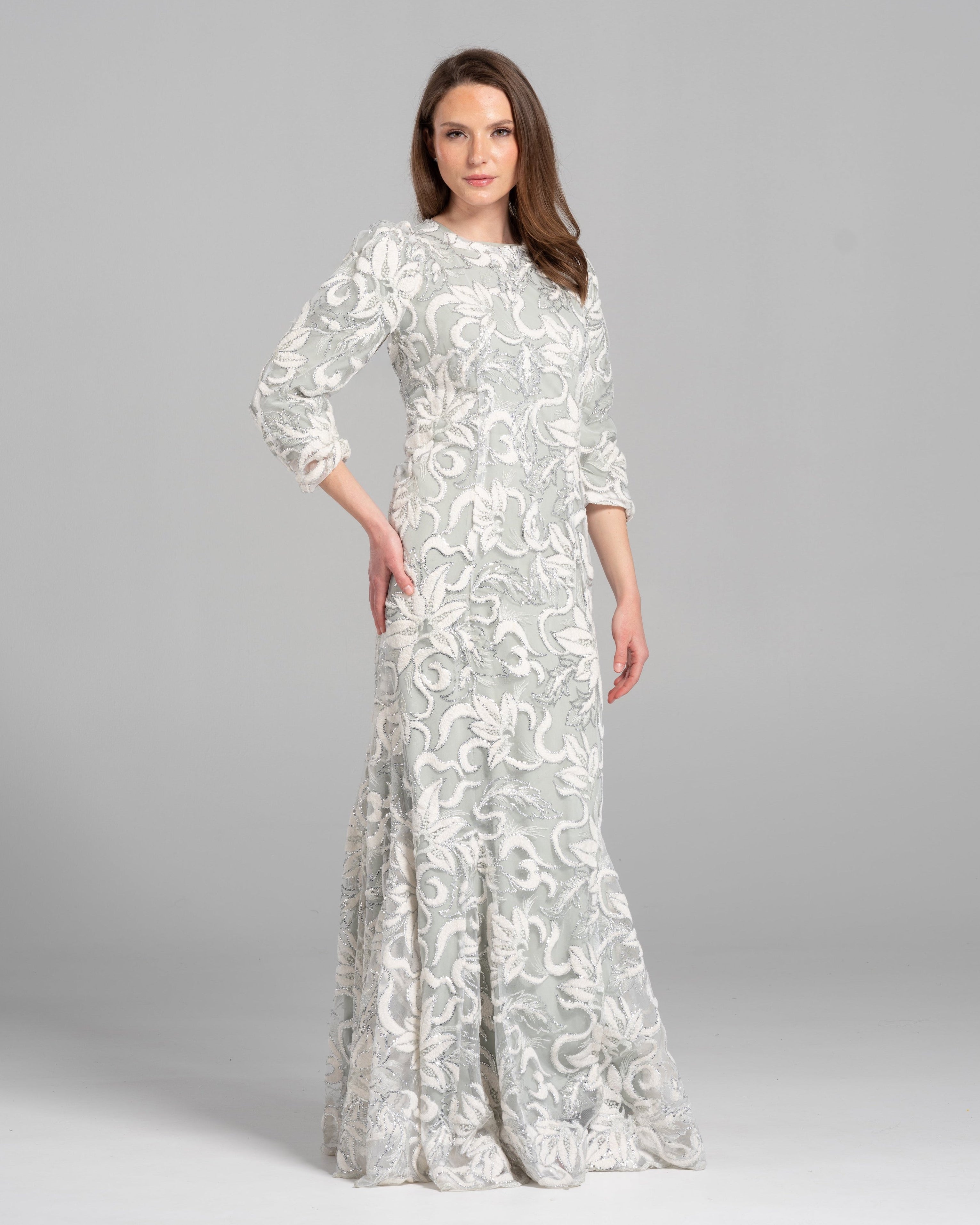 A soft sage chenille brings rich texture and depth to this elegant mermaid silhouette. The fitted shape gently contours through the bodice and hips before subtly flaring, while delicate sleeves and an intricate pattern add a refined finish.
