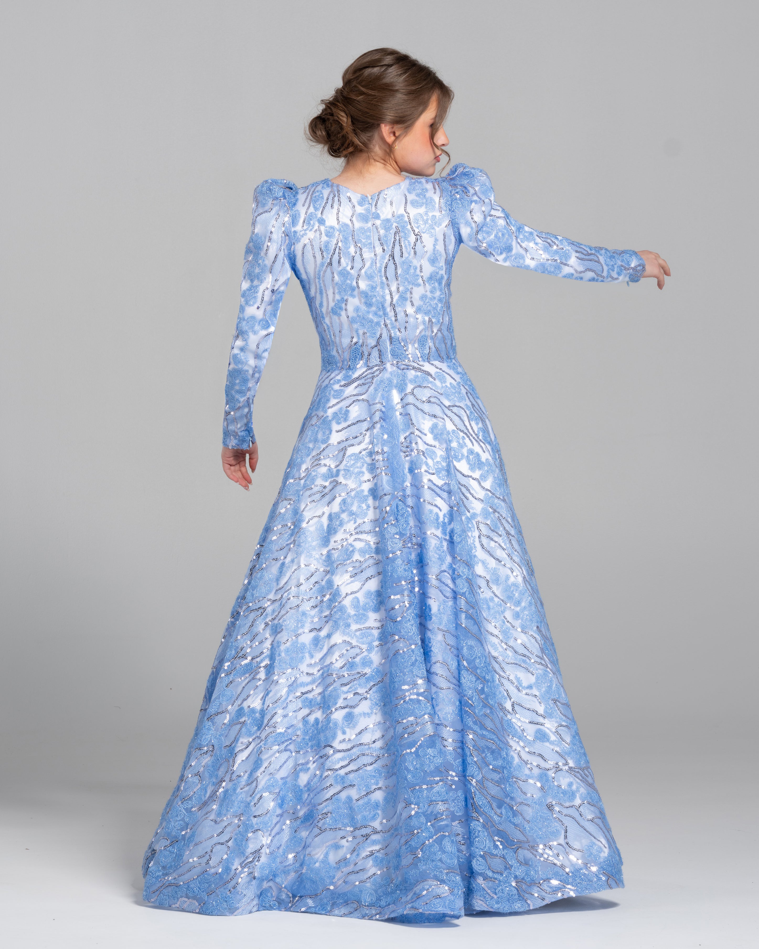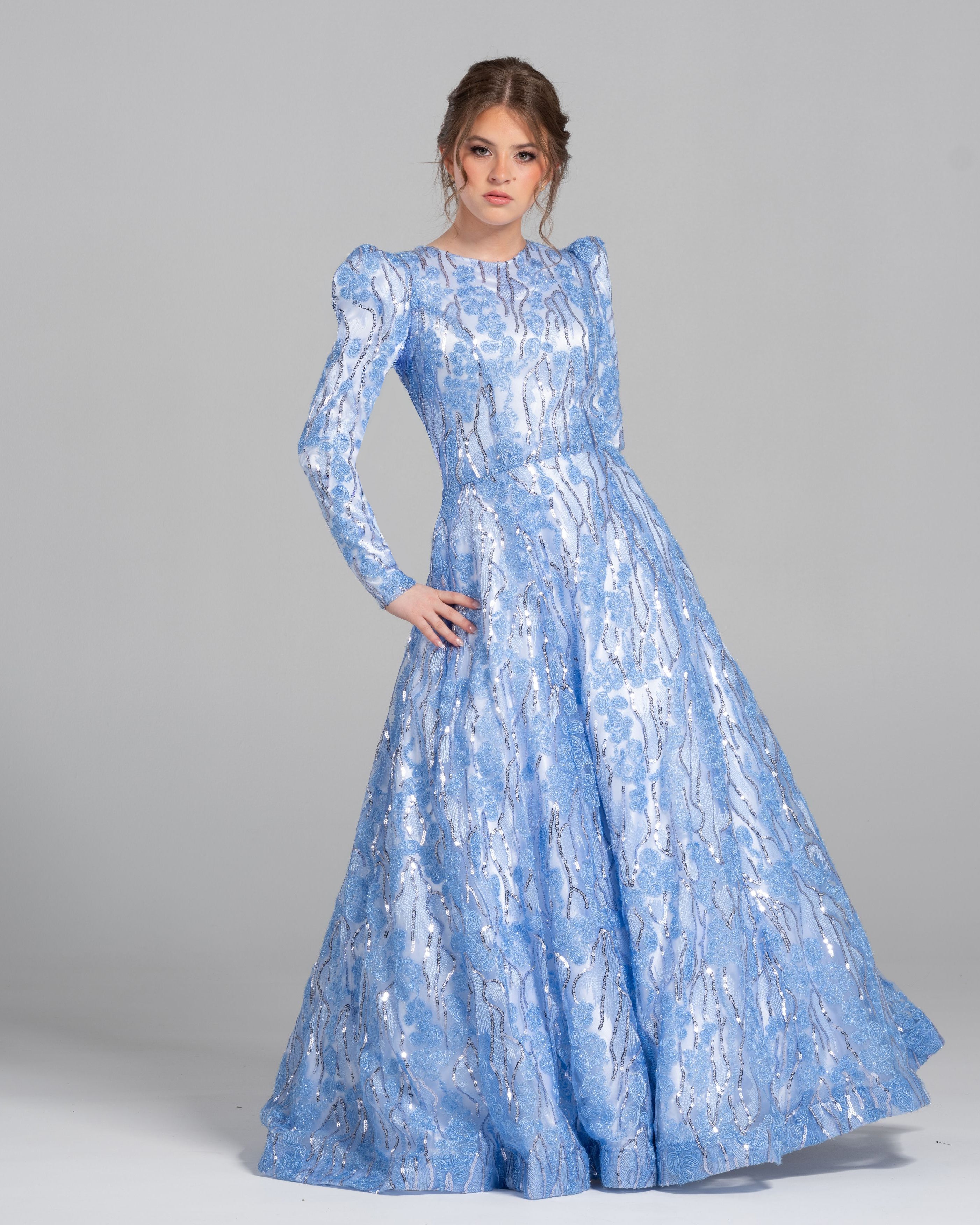 A softly structured bodice with subtle puffed shoulders flows into a full, sweeping skirt, creating a clean, elongated silhouette. Rendered in a soft sky-blue shade, the fabric is traced with intricate branches and blossom motifs that add texture and a delicate shimmer.