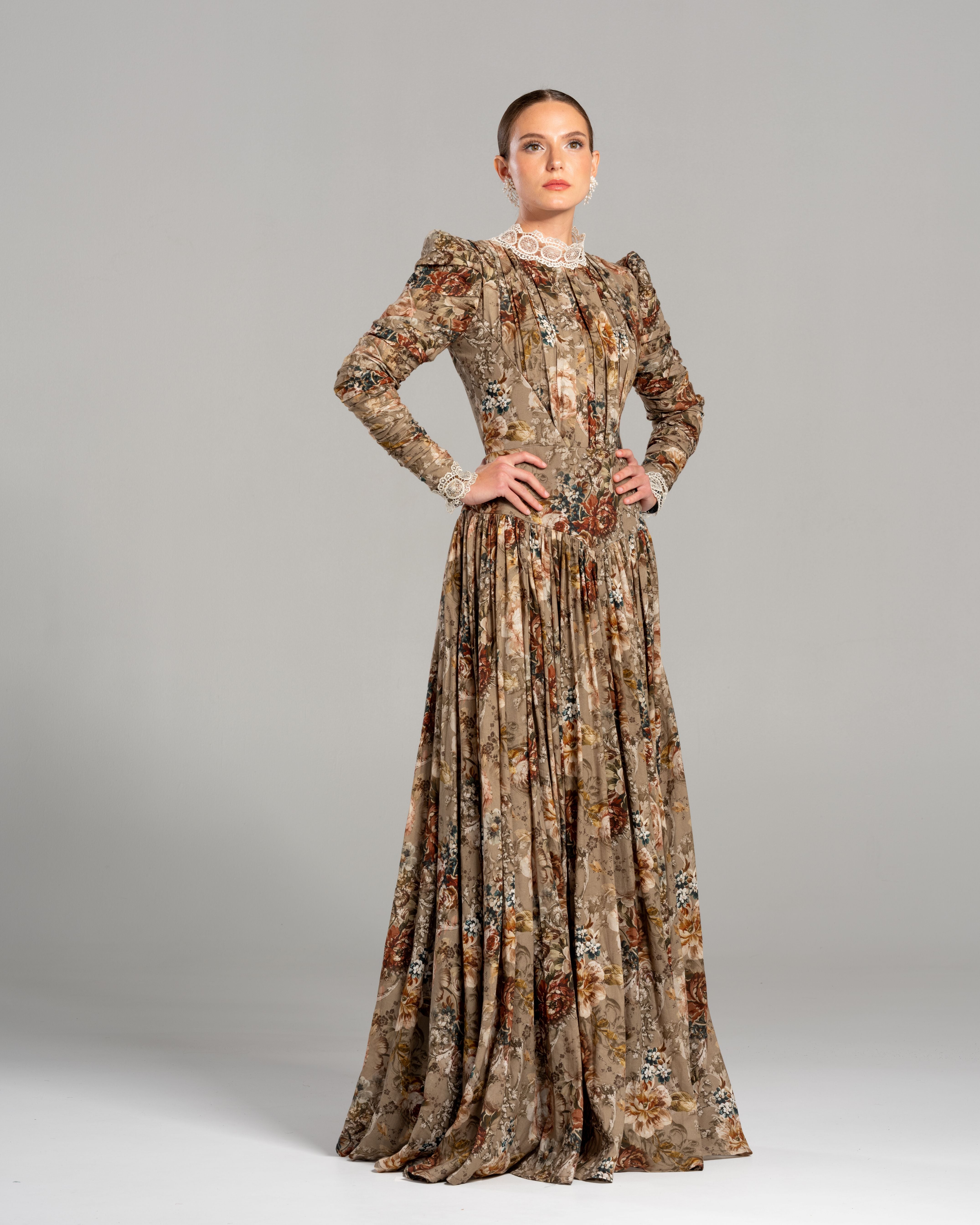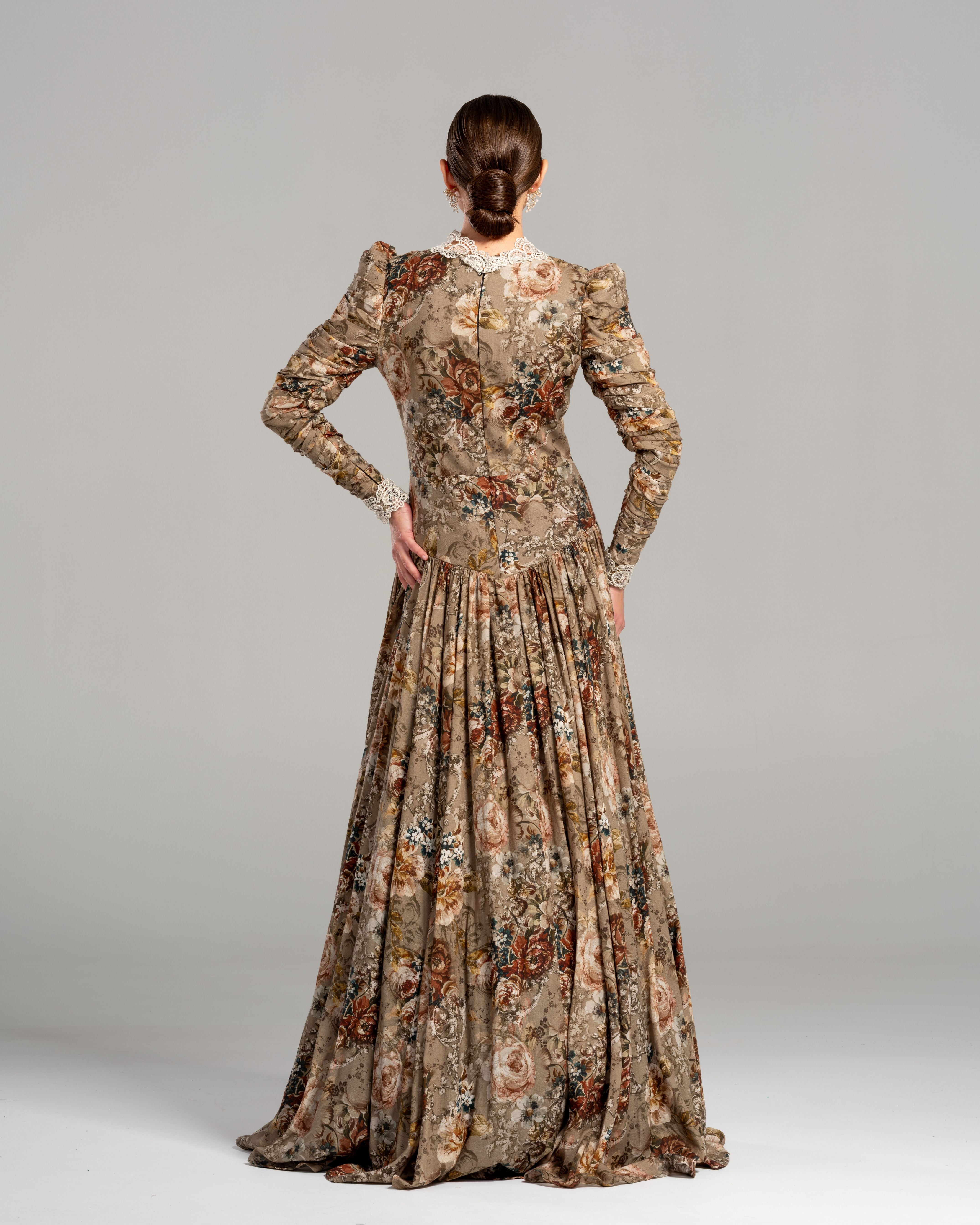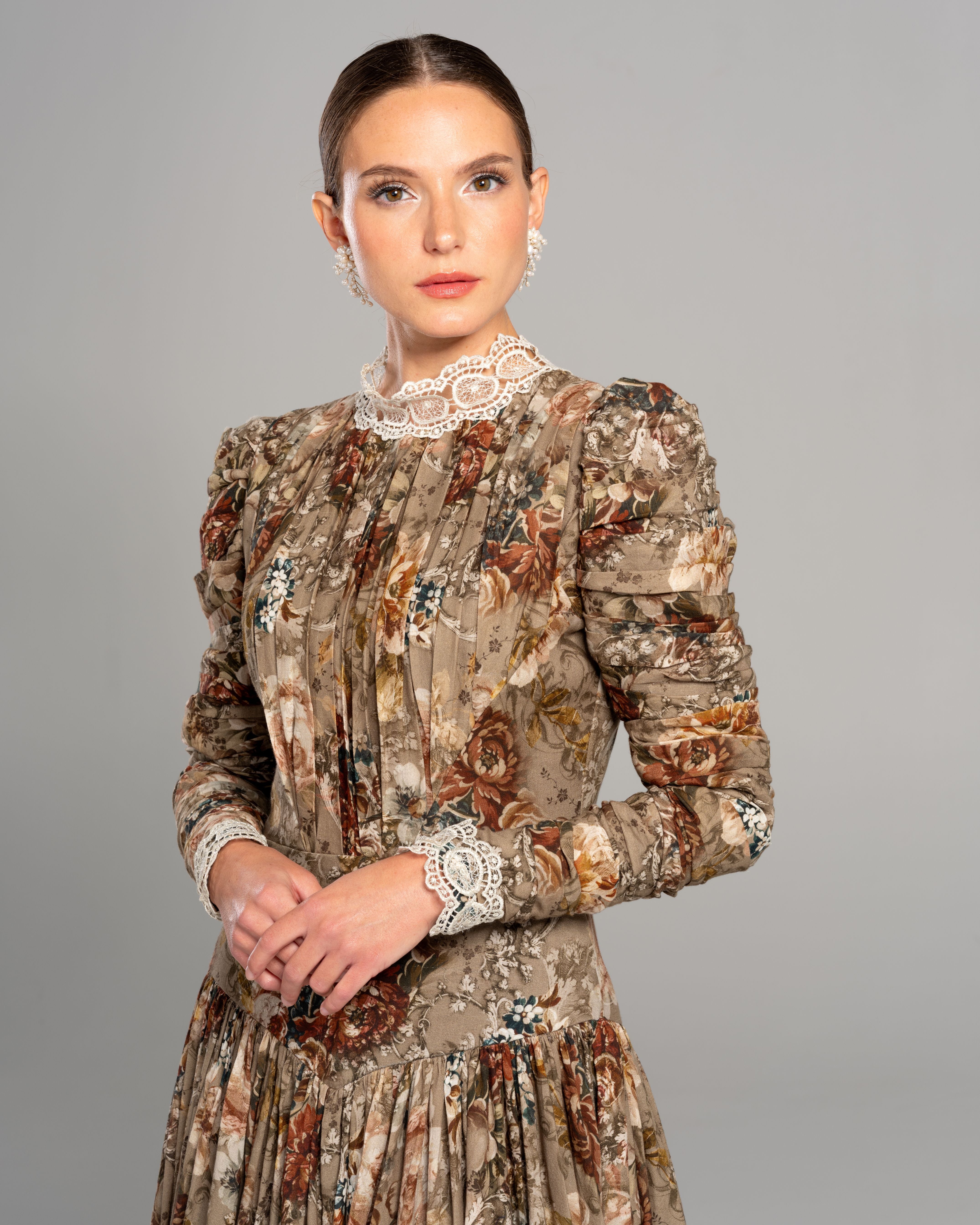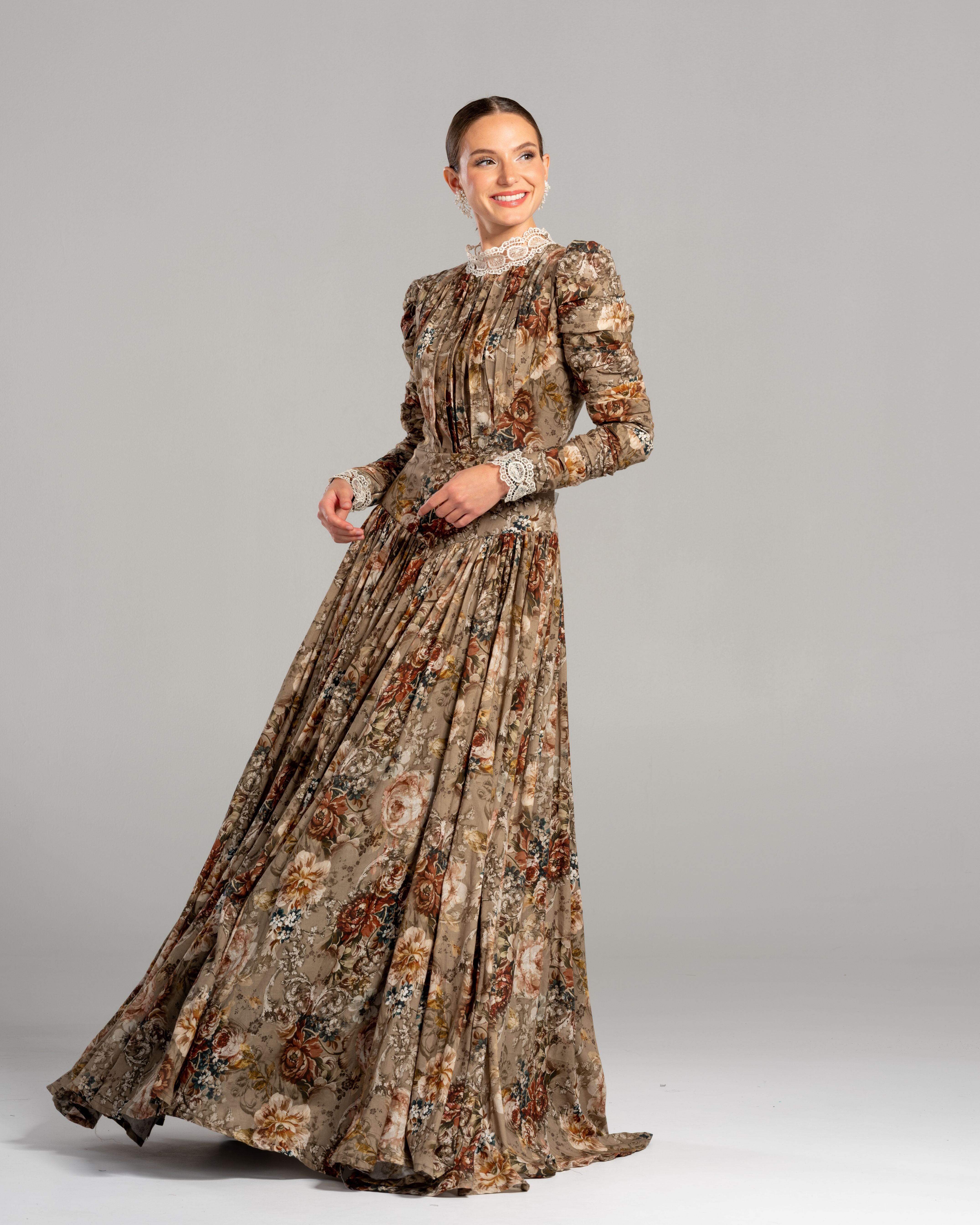 This gown features a vintage-inspired floral print on soft, textured fabric in warm earthy tones. The high lace-trimmed collar and matching lace cuffs add a touch of delicate refinement, while the pleated bodice and gathered waist create a structured yet flowing silhouette.