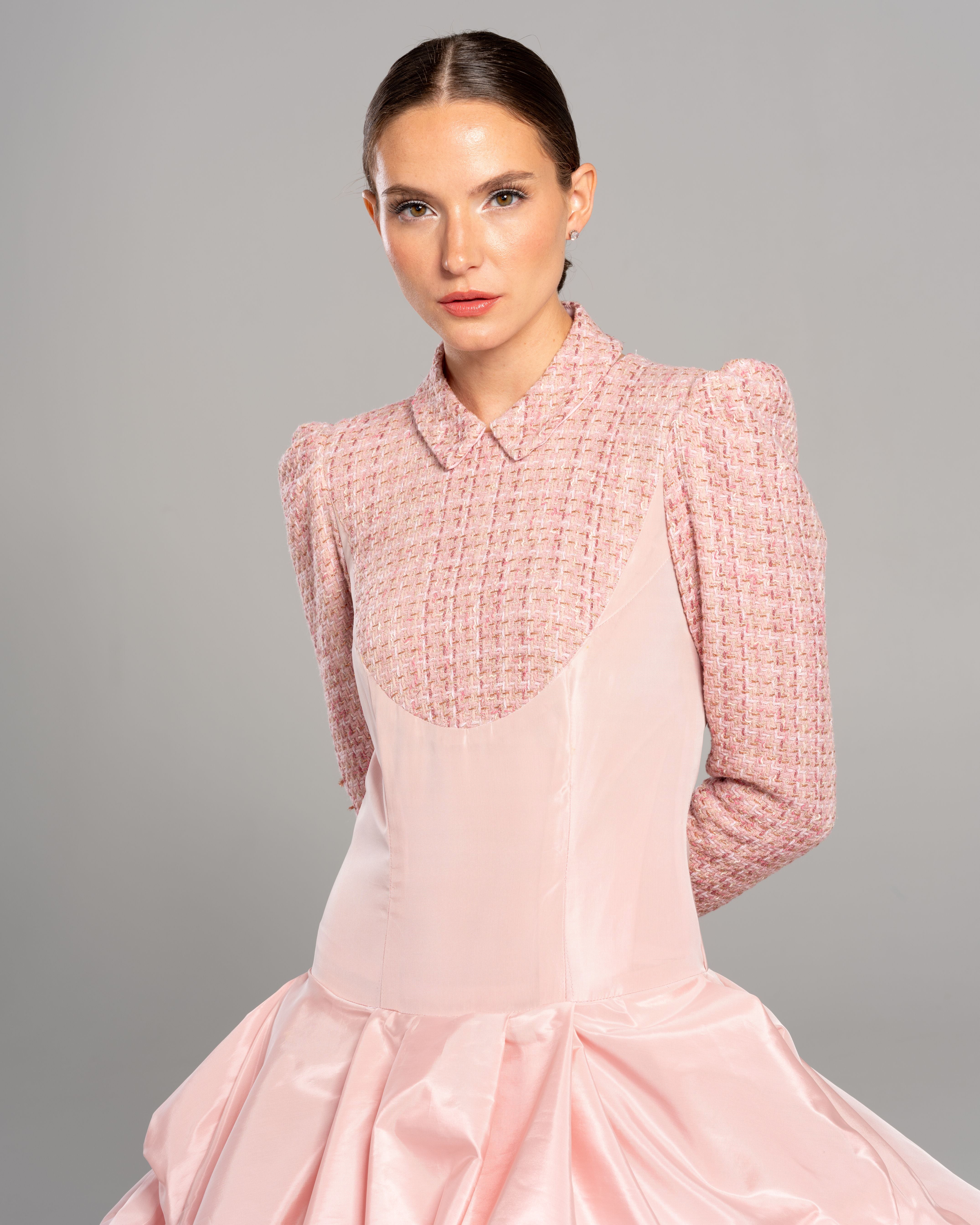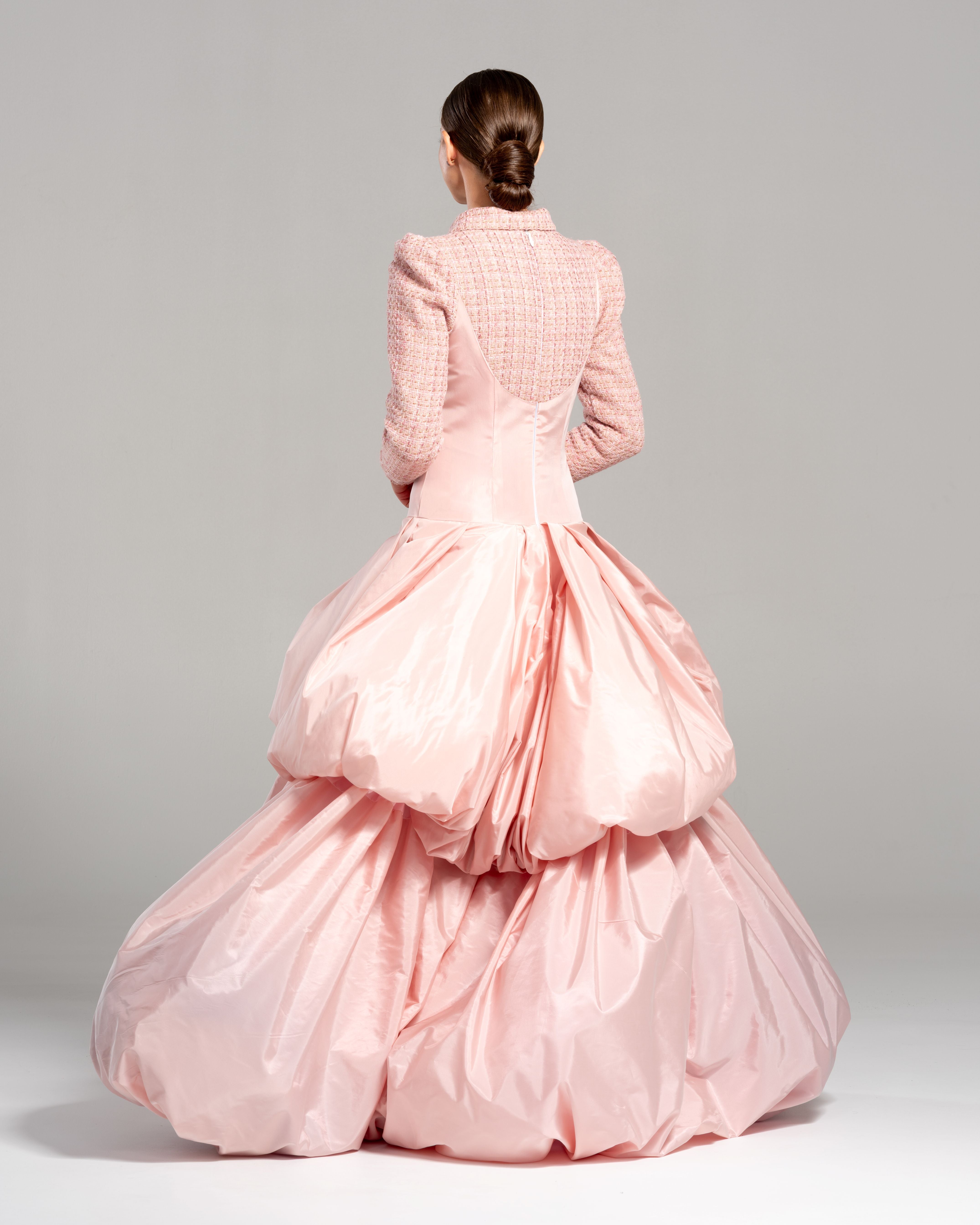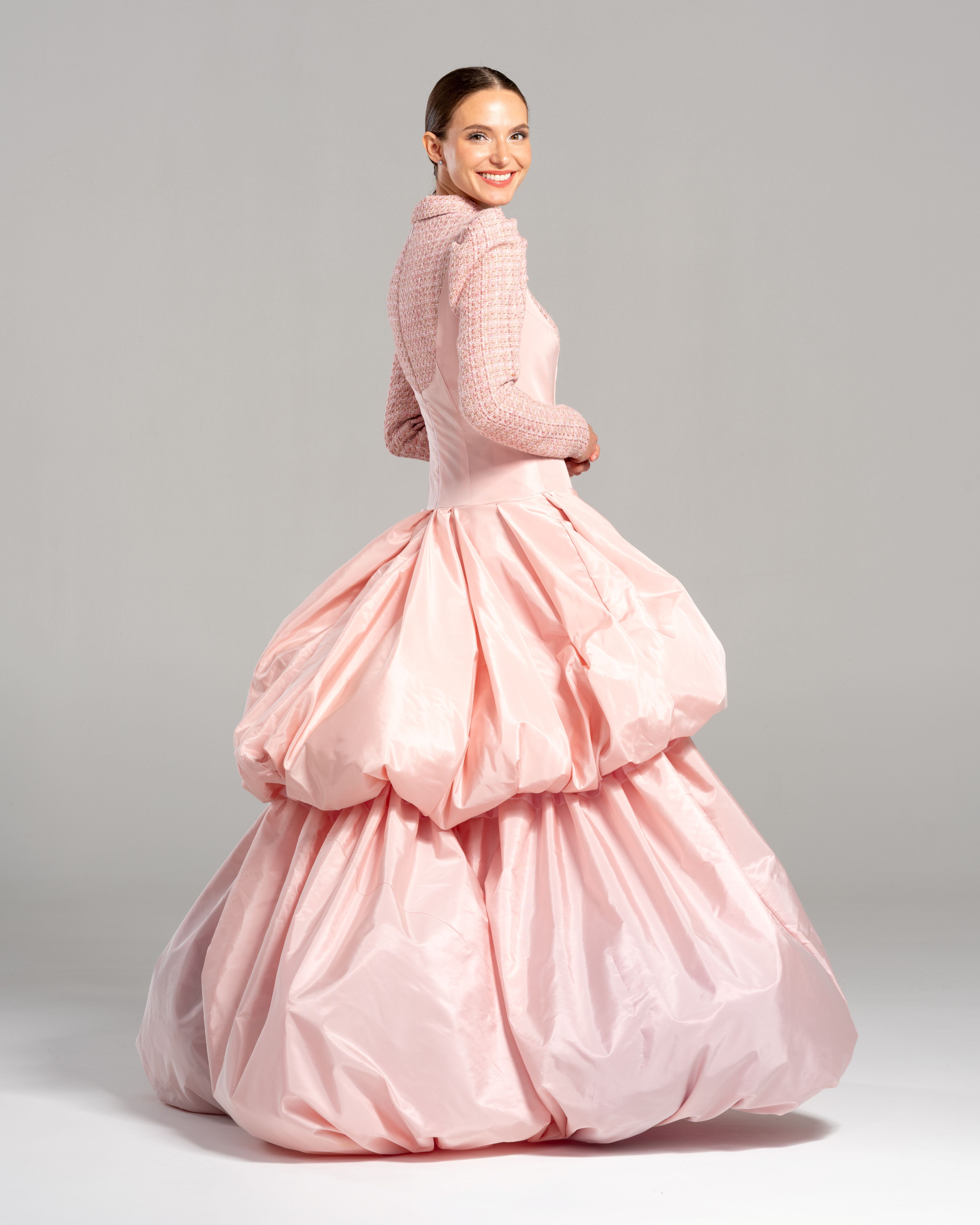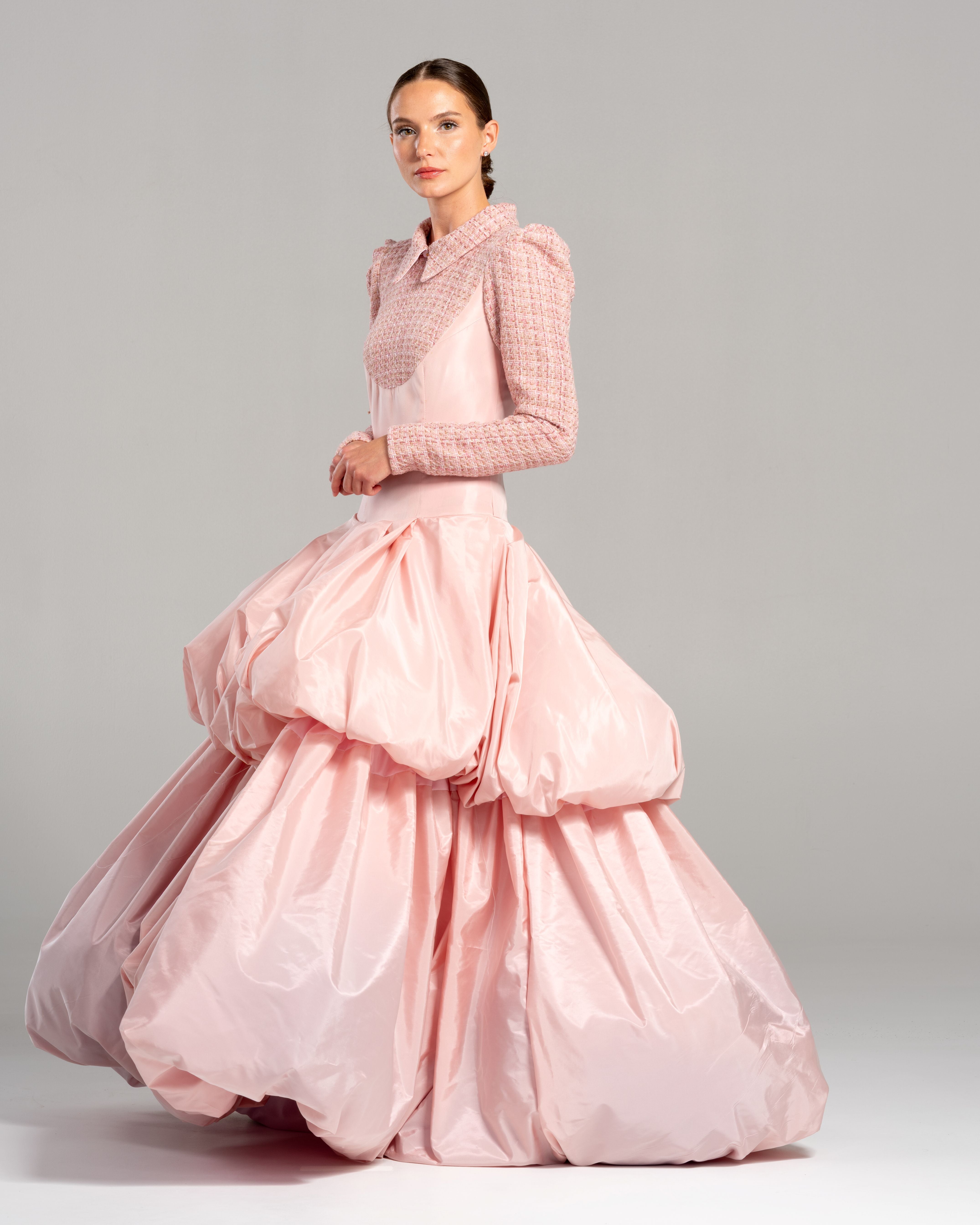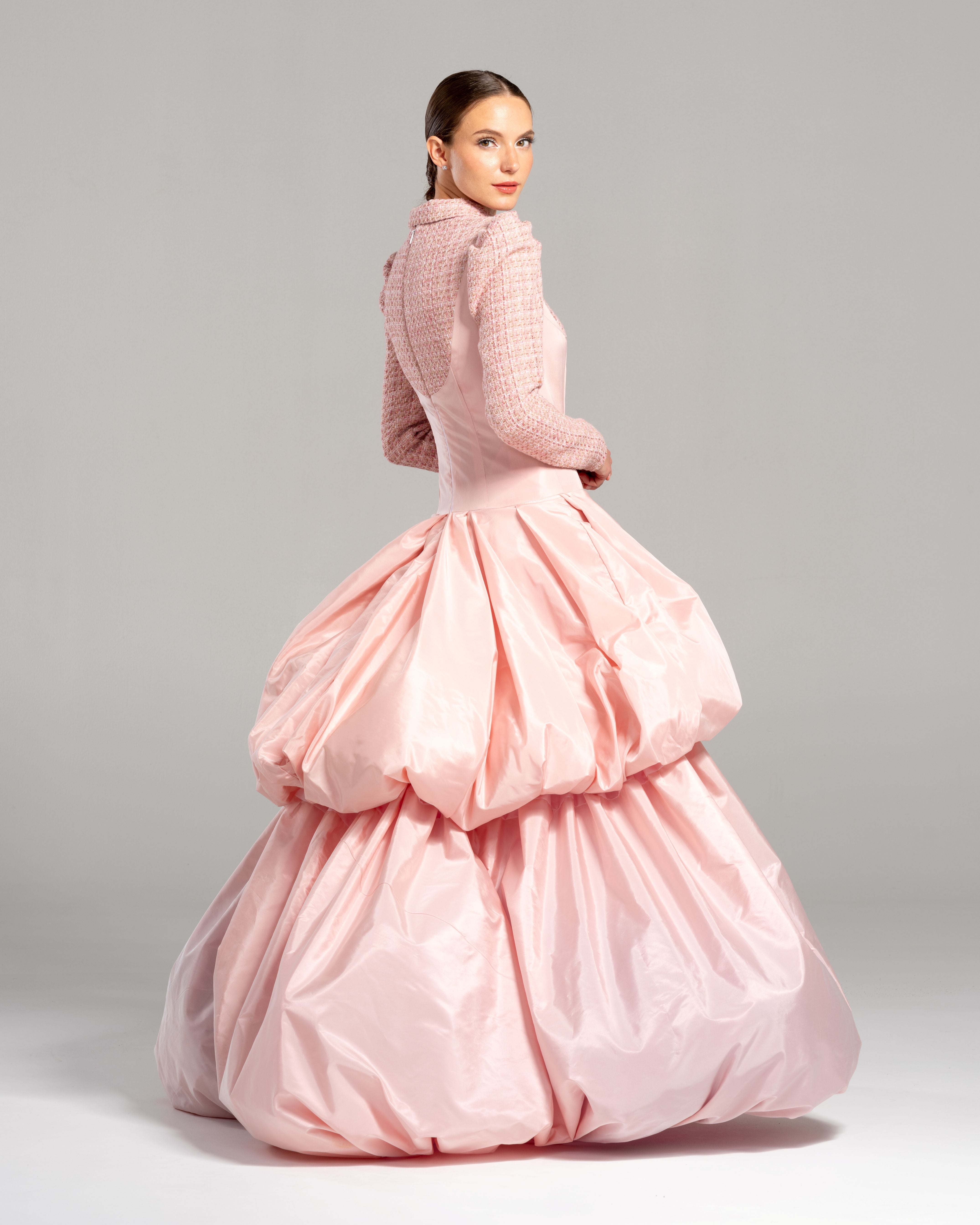 A vision of sculptural romance, the Bubbled Boucle' Gown blends structure and softness in the most captivating way. The bodice, crafted from a delicate pink boucle' with gentle puffed sleeves, lends a refined texture that contrasts beautifully with the luminous taffeta skirt. The voluminous, gathered silhouette blooms dramatically from the drop waist, creating an airy yet commanding presence.