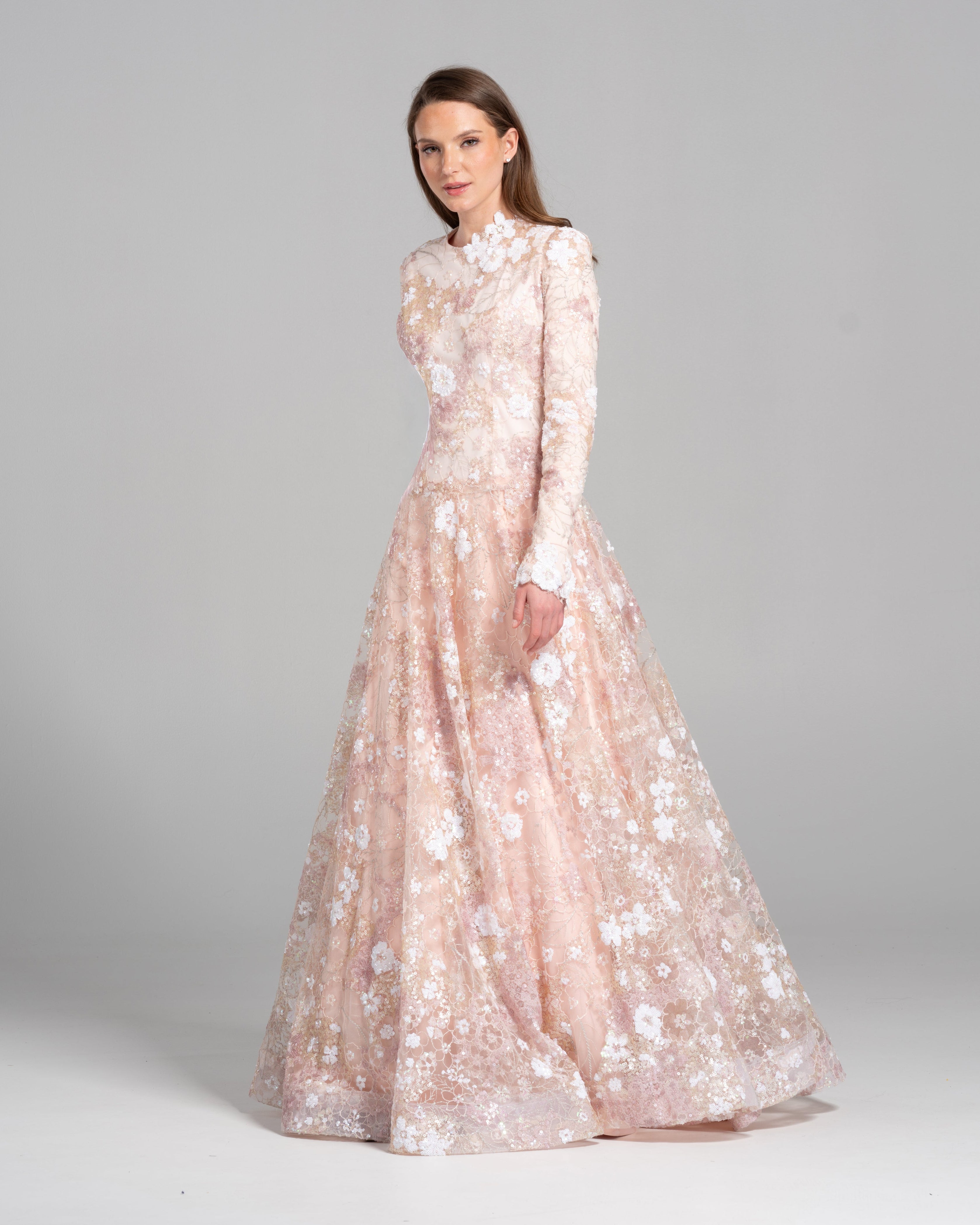 A soft blush base layered with delicate floral texture creates a romantic, luminous effect throughout. The fitted bodice with a refined neckline and long sleeves flows into a full, sweeping skirt.