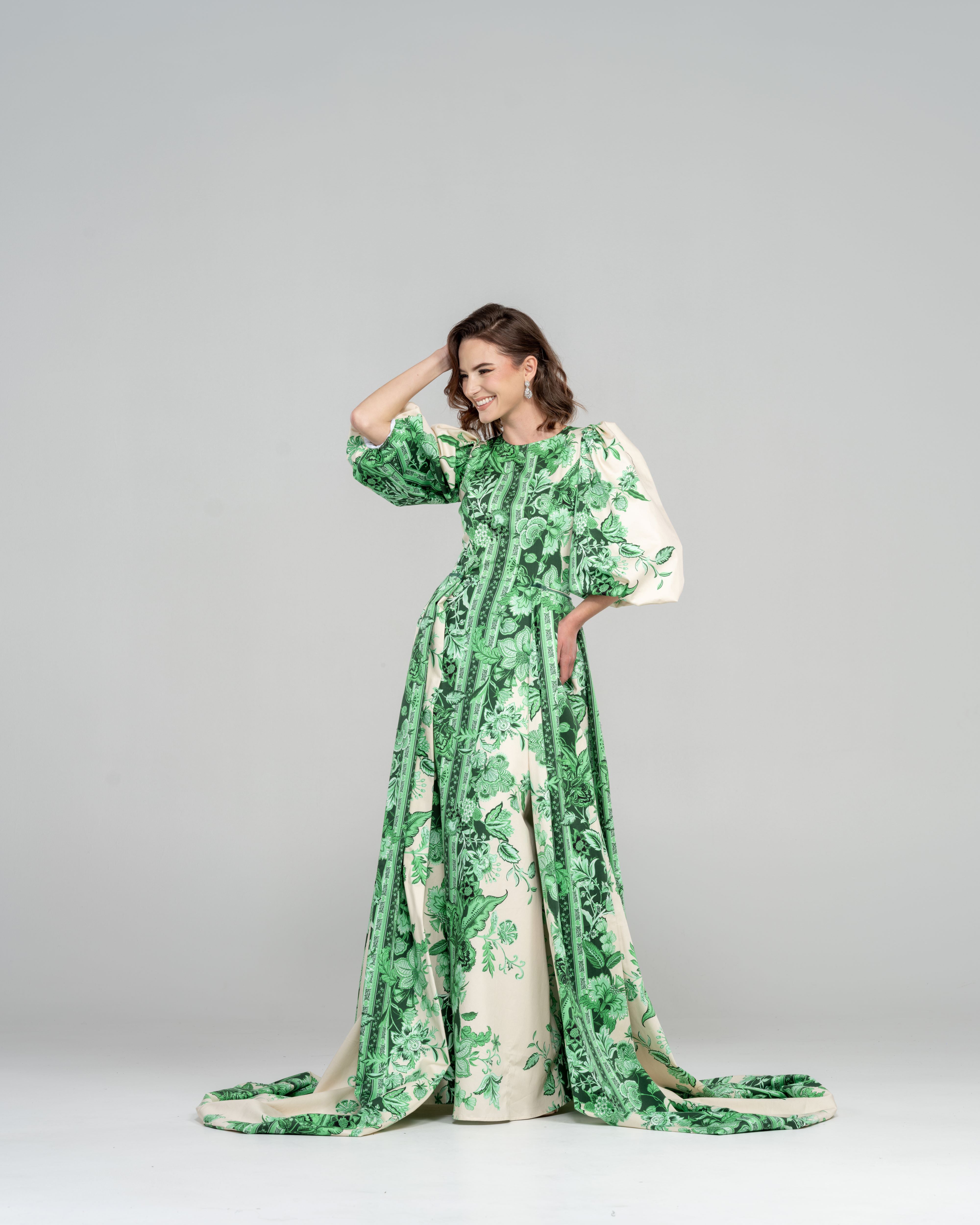 Crafted from luxurious mikado stretch fabric in a rich green and ivory floral pattern, this gown is designed to make a statement. The striking, removable back skirt cape offers a dramatic flair for the ceremony, while its detachable design ensures effortless movement when it’s time to dance. The bubble sleeves add a playful touch, and the optional mock neck creates a sleek, sophisticated look.