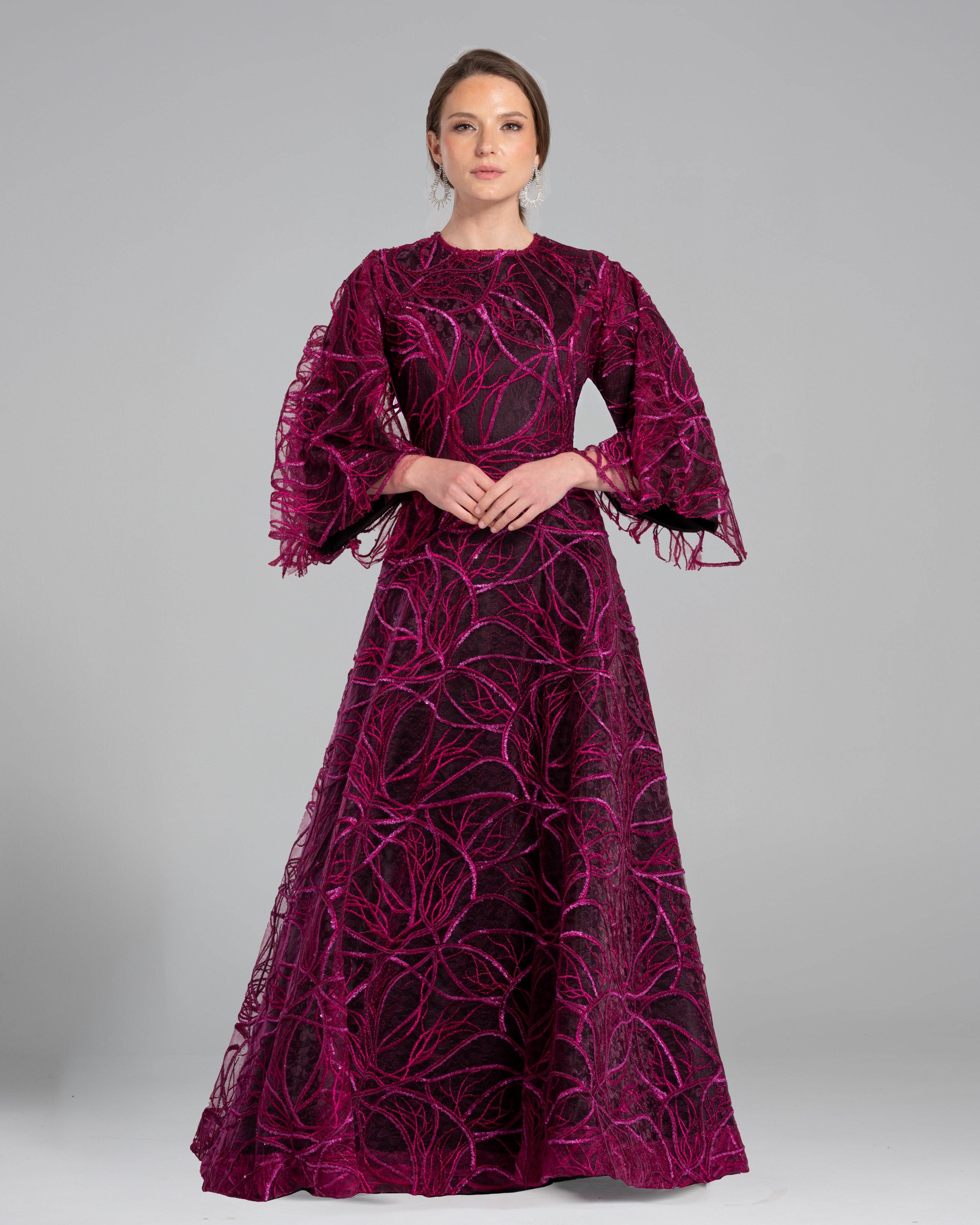 A rich fuchsia overlay of intricate, textured embroidery is set against a dark base, creating depth and striking contrast throughout. Flared dramatic sleeves balance the structured bodice and full skirt.