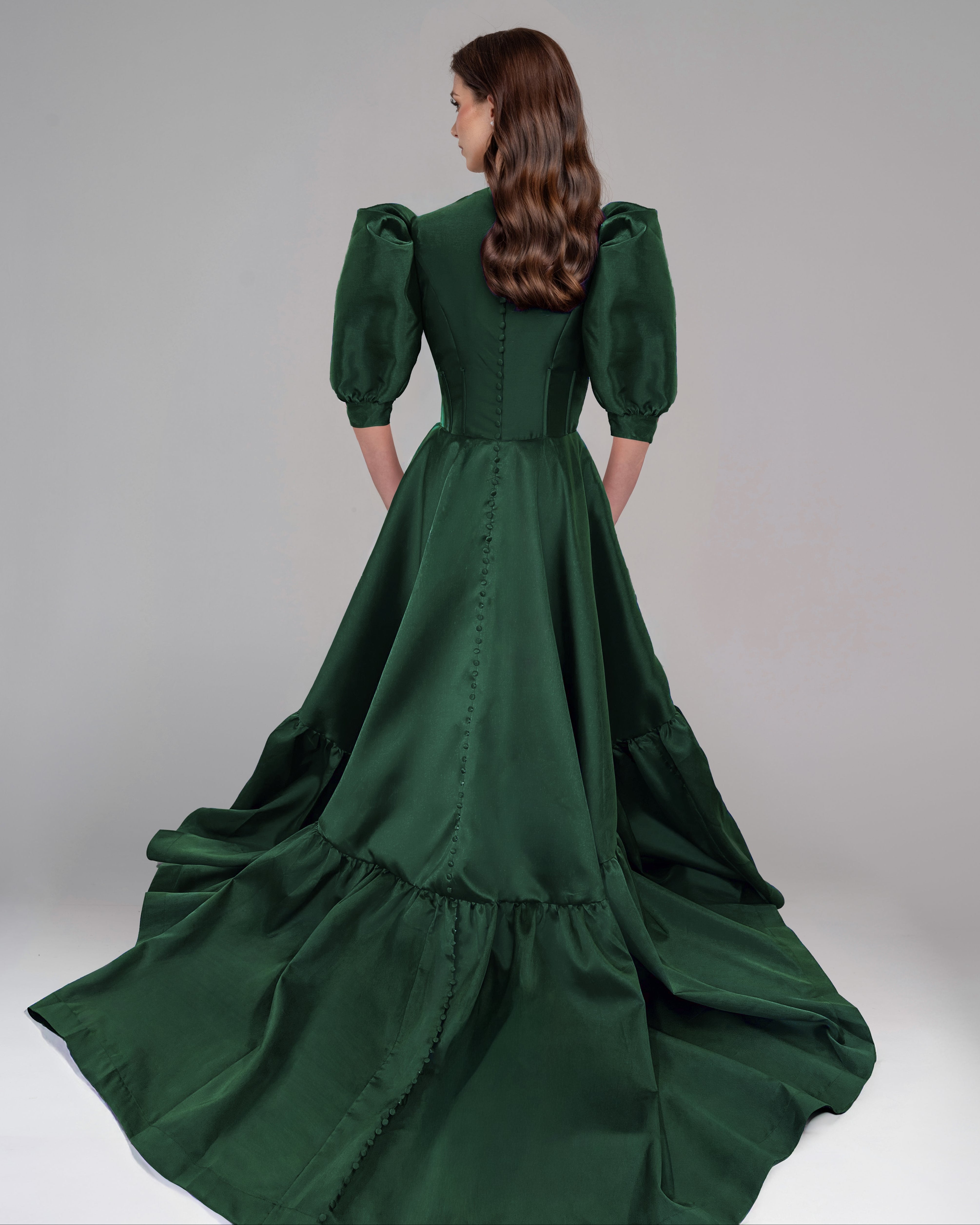 A symphony of elegance and poise, this gown features a sculpted bodice with flattering boning at the waist that beautifully defines the silhouette. Voluminous puff sleeves and a sweeping mikado skirt flow into a romantic train, finished with a trail of delicate covered buttons cascading down the back for a timeless touch.