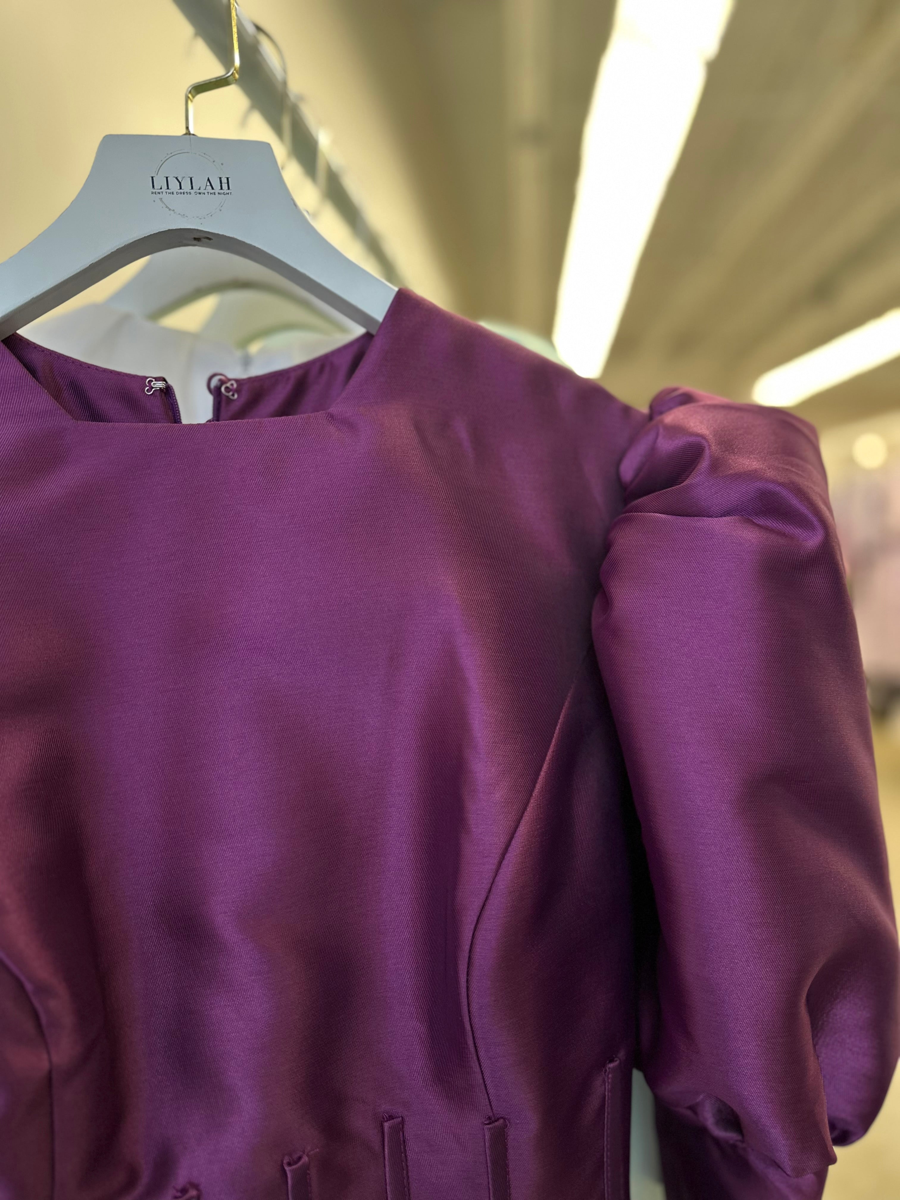 A symphony of elegance and poise, this gown features a sculpted bodice with flattering boning at the waist that beautifully defines the silhouette. Voluminous puff sleeves and a sweeping mikado skirt flow into a romantic train, finished with a trail of delicate covered buttons cascading down the back for a timeless touch.